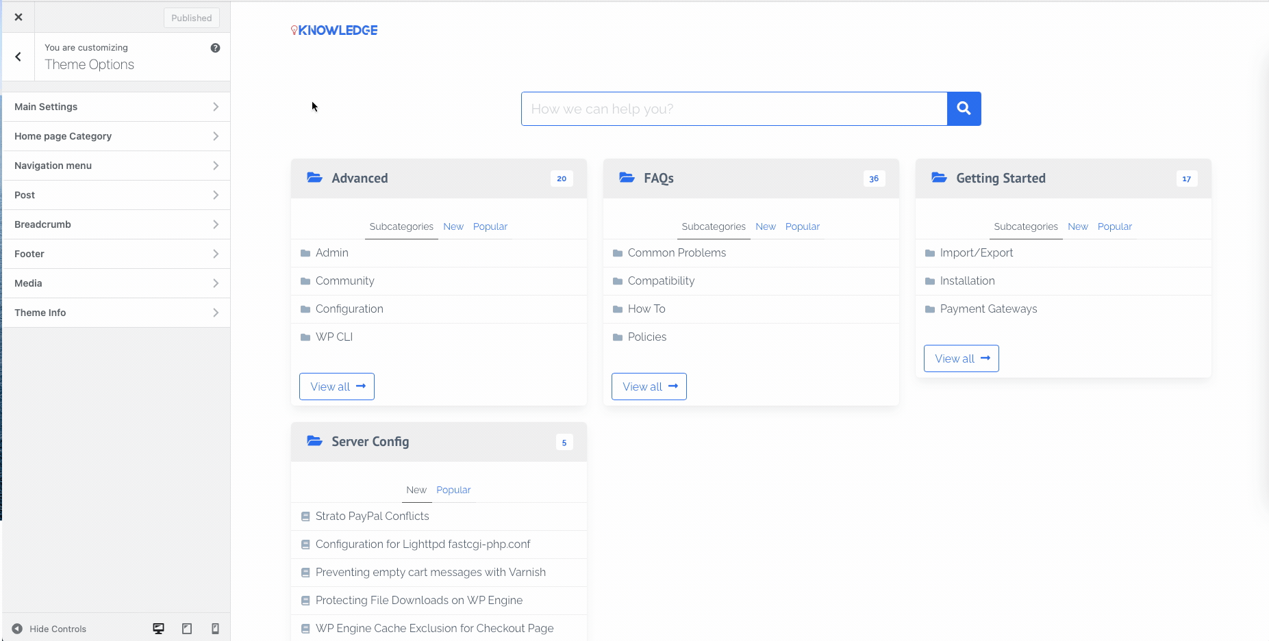Managing the settings for displaying categories on the main page, navigation: Customize -> Theme Options – > Home page Category